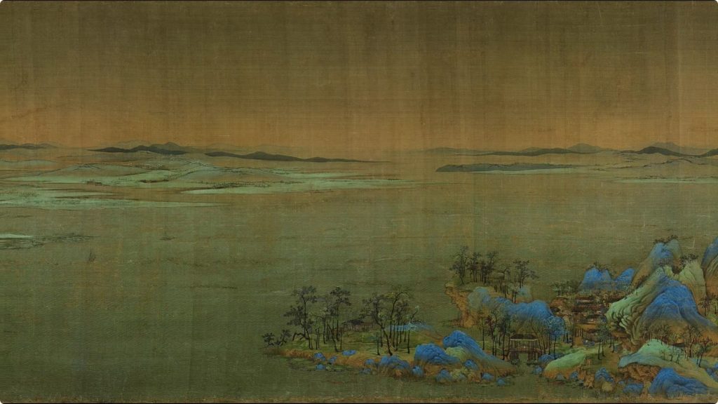 千里江山图卷(The Scroll of One Thousand Li River and Mountains)是中国的一幅著名的绘画作品,由明代画家徐禎绘制于17世纪。这幅作品以水墨为主要媒介,呈现了中国山水画的典型特点。